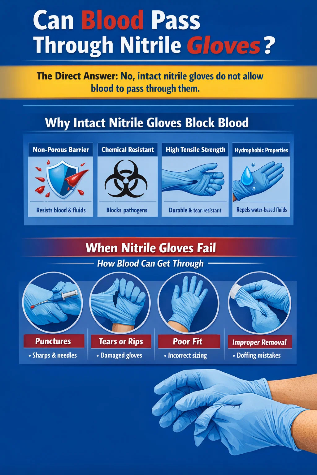 HIV on suhteellisen herkkä virus kehon ulkopuolella. Ehjät nitriilikäsineet tarjoavat täydellisen esteen HIV-tartunnalta veren kautta. Sekä CDC että OSHA vahvistavat, että oikein käytetyt kertakäyttökäsineet, mukaan lukien nitriili, estävät ihokosketuksen mahdollisesti HIV-tartunnan saaneen veren kanssa. Ammatillinen tartuntariski neulanpistosta käsineen läpi on noin 0,3 % tapausta kohden – käsine itsessään ei poista neulaa, mutta se pyyhkii huomattavan määrän verta pois neulasta ennen kuin se koskettaa ihoa, mikä vähentää inokulaattia.