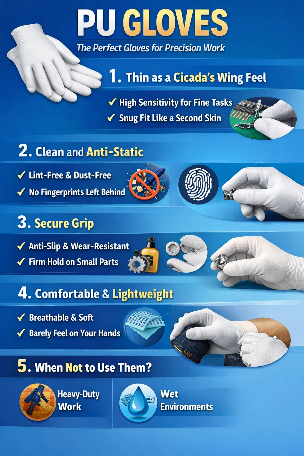 Antistaattinen ja pölytön: Tämä materiaali itsessään ei ole herkkä pölyämään, joten se on ensisijainen valinta elektroniikkatehtaille ja tarkkuusinstrumenttien kokoonpanoon. Jos korjaat matkapuhelinta, kokoat tietokonetta tai puhdistat kalliita linssejä kotona, näiden suojakäsineiden käyttö suojaa käsiäsi likaamatta osia.