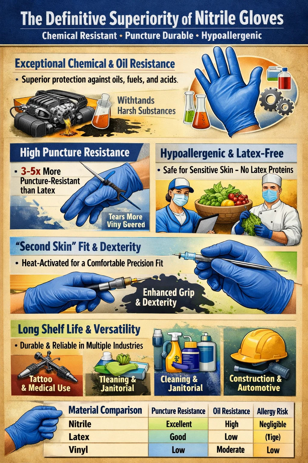 Ensisijainen tekijä, joka tekee nitriilikäsineet erityistä on heidän vertaansa vailla oleva yhdistelmä kemikaalien kestävyyttä, pistokestävyyttä ja hypoallergeenisia ominaisuuksia lateksi- tai vinyylivaihtoehtoihin verrattuna. Toisin kuin luonnonkumi, nitriili on synteettinen kopolymeeri, joka tarjoaa vankan suojan öljypohjaisia tuotteita, öljyjä ja happoja vastaan, mikä tekee siitä alan standardin autoteollisuudessa, lääketieteessä ja teollisissa sovelluksissa.